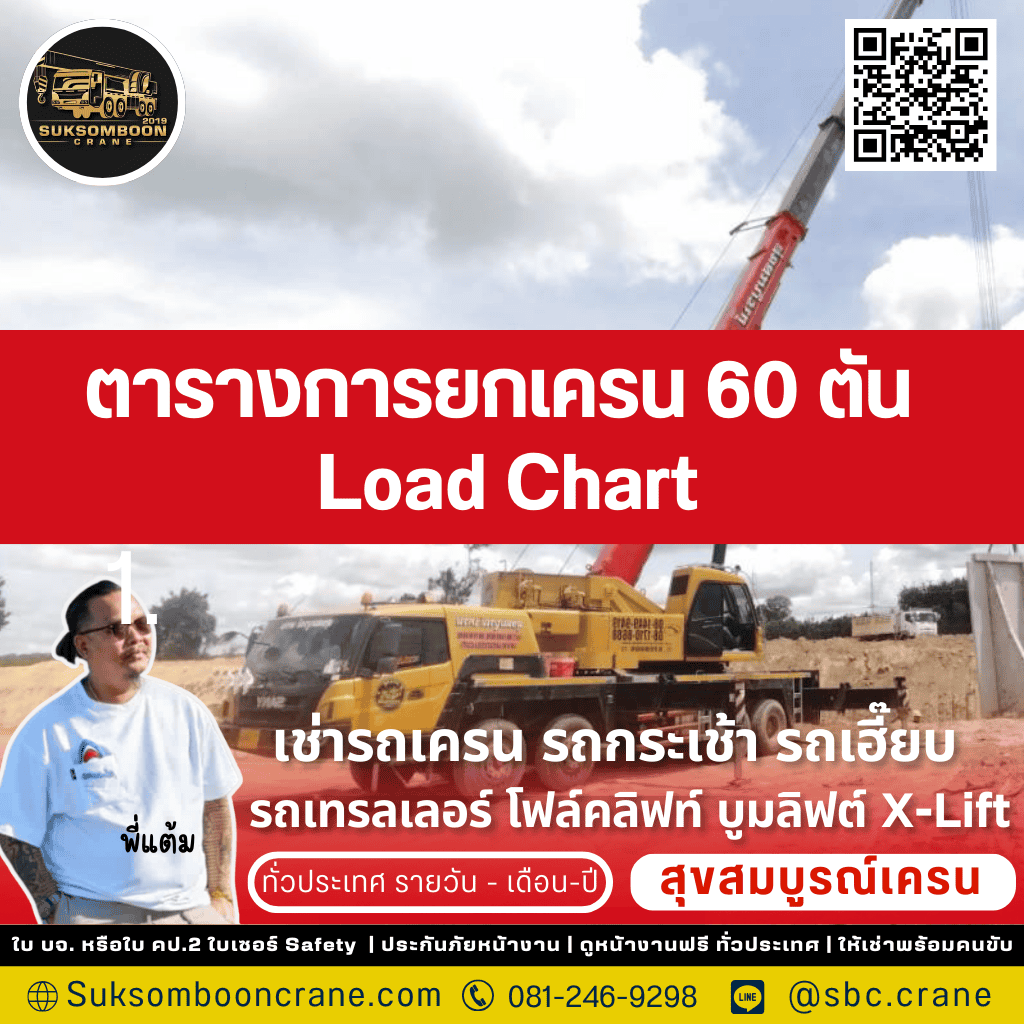 ตารางการยกเครน 60 ตัน (Load Chart) เป็นข้อมูลสำคัญที่ผู้ใช้งานเครนทุกคนต้องเข้าใจ การเลือกพาร์ทเนอร์ที่เชี่ยวชาญจึงเป็นเรื่องสำคัญ เลือก พี่แต้ม สุขสมบูรณ์เครน 2019 เพื่อให้คุณได้มากกว่ารถเช่า แต่คือความมั่นใจเต็มร้อยจากทีมงานที่พร้อมวางแผนการยก, ความปลอดภัยสูงสุดด้วยรถที่มีเอกสาร ปจ.2 ครบ, และการดูแลโดยตรงจากพี่แต้ม (เจ้าของ) ที่พร้อมให้คำปรึกษาและแก้ปัญหาหน้างานอย่างรวดเร็วตลอด 24 ชั่วโมง