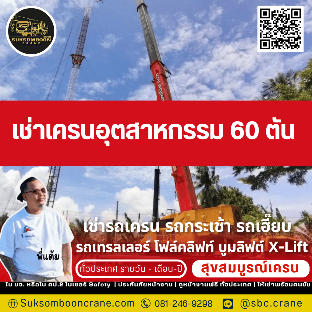 เช่าเครนอุตสาหกรรม 60 ตัน คือการเลือกความแม่นยำและปลอดภัยสำหรับโรงงานของคุณ เลือก พี่แต้ม สุขสมบูรณ์เครน 2019 เพื่อให้คุณได้มากกว่ารถเช่า แต่คือความมั่นใจเต็มร้อยจากทีมงานมืออาชีพที่มีประสบการณ์, ความปลอดภัยสูงสุดด้วยรถที่มีเอกสาร ปจ.2 ครบ, และการดูแลโดยตรงจากพี่แต้ม (เจ้าของ) ที่พร้อมให้คำปรึกษาและแก้ปัญหาหน้างานอย่างรวดเร็วตลอด 24 ชั่วโมง