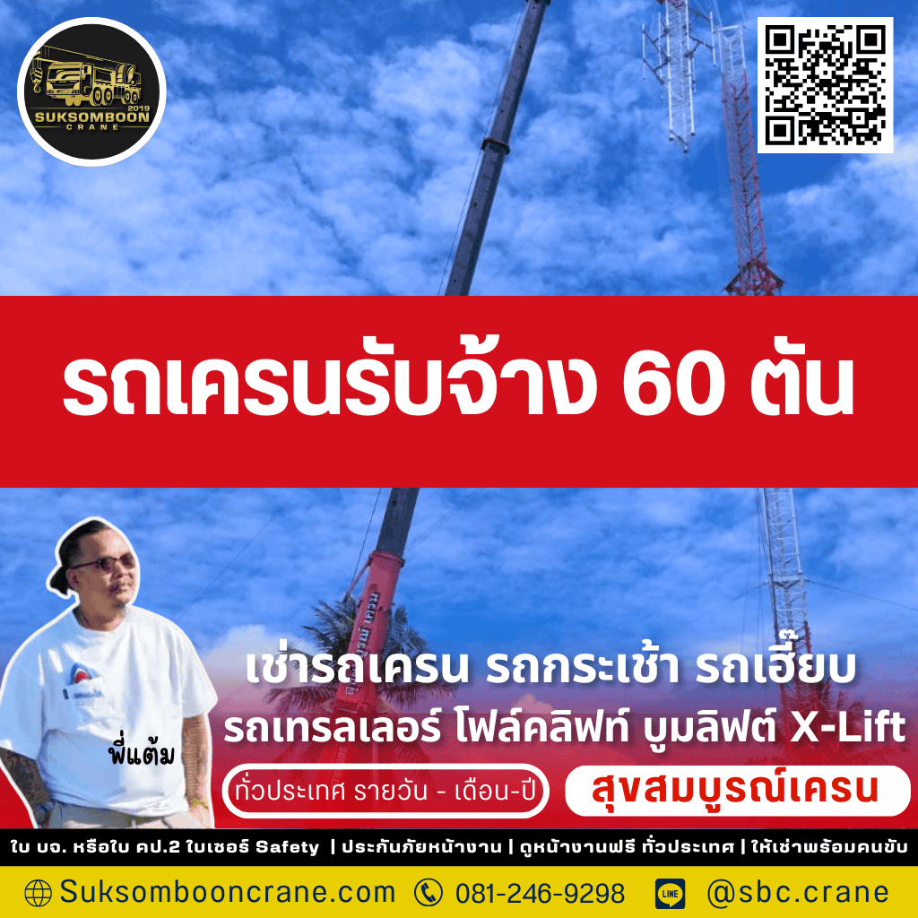 บริการรถเครนรับจ้าง 60 ตัน จากพี่แต้ม สุขสมบูรณ์เครน คือการตัดสินใจที่สำคัญที่ส่งผลต่อความสำเร็จของโปรเจกต์โดยตรง เลือกเราเพื่อให้คุณได้มากกว่ารถเช่า แต่คือความมั่นใจเต็มร้อยจากทีมงานมืออาชีพที่มีประสบการณ์, ความปลอดภัยสูงสุดด้วยรถที่มีเอกสาร ปจ.2 ครบ, และการดูแลโดยตรงจากพี่แต้ม (เจ้าของ) ที่พร้อมให้คำปรึกษาและแก้ปัญหาหน้างานอย่างรวดเร็วตลอด 24 ชั่วโมง