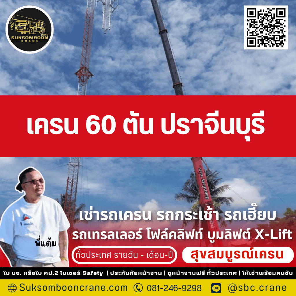 เช่าเครน 60 ตัน ปราจีนบุรี คือการตัดสินใจครั้งสำคัญที่ส่งผลต่อความสำเร็จของโปรเจกต์โดยตรง เลือก พี่แต้ม สุขสมบูรณ์เครน 2019 เพื่อให้คุณได้มากกว่ารถเช่า แต่คือความมั่นใจเต็มร้อยจากทีมงานมืออาชีพที่มีประสบการณ์, ความปลอดภัยสูงสุดด้วยรถที่มีเอกสาร ปจ.2 ครบ, และการดูแลโดยตรงจากพี่แต้ม (เจ้าของ) ที่พร้อมให้คำปรึกษาและแก้ปัญหาหน้างานอย่างรวดเร็วตลอด 24 ชั่วโมง